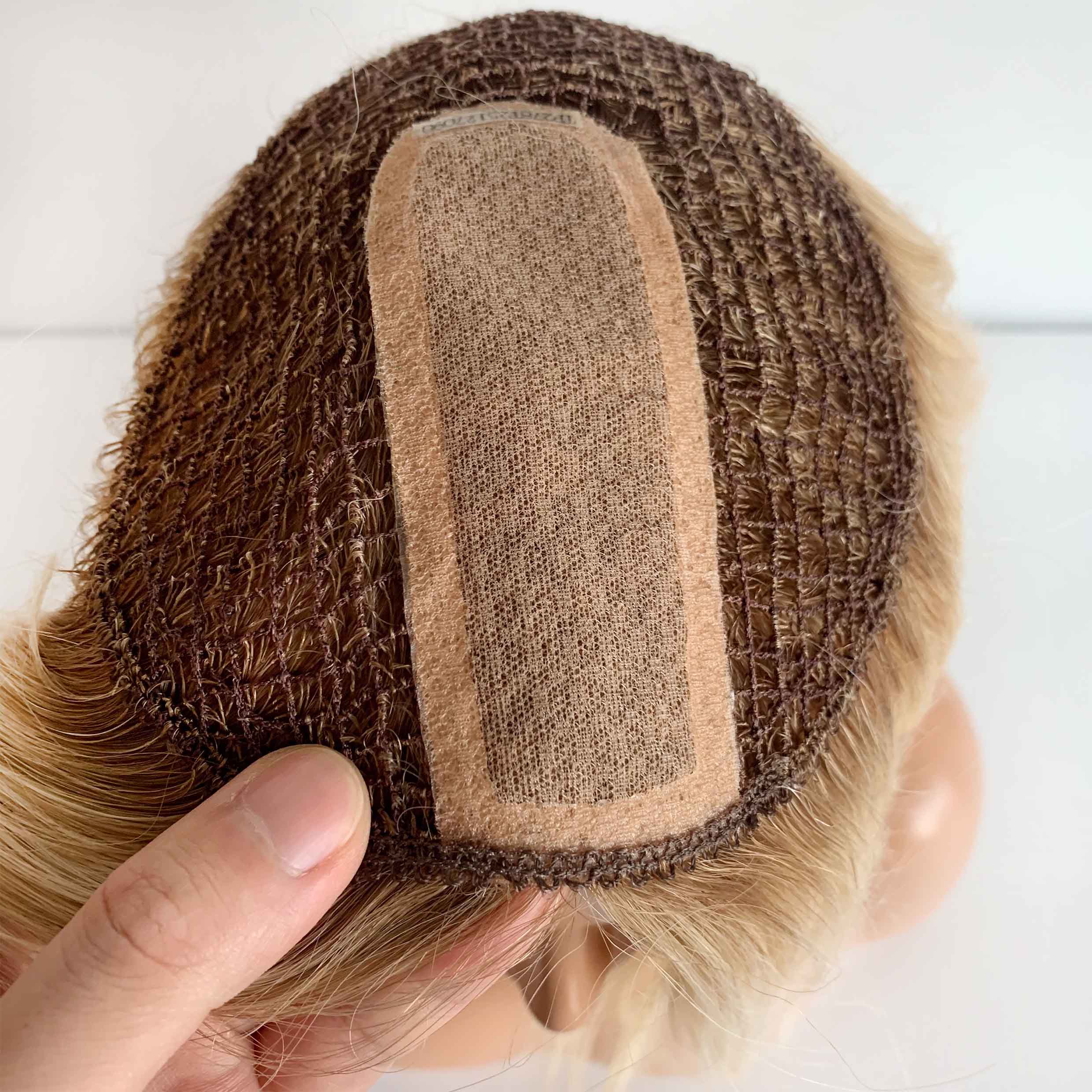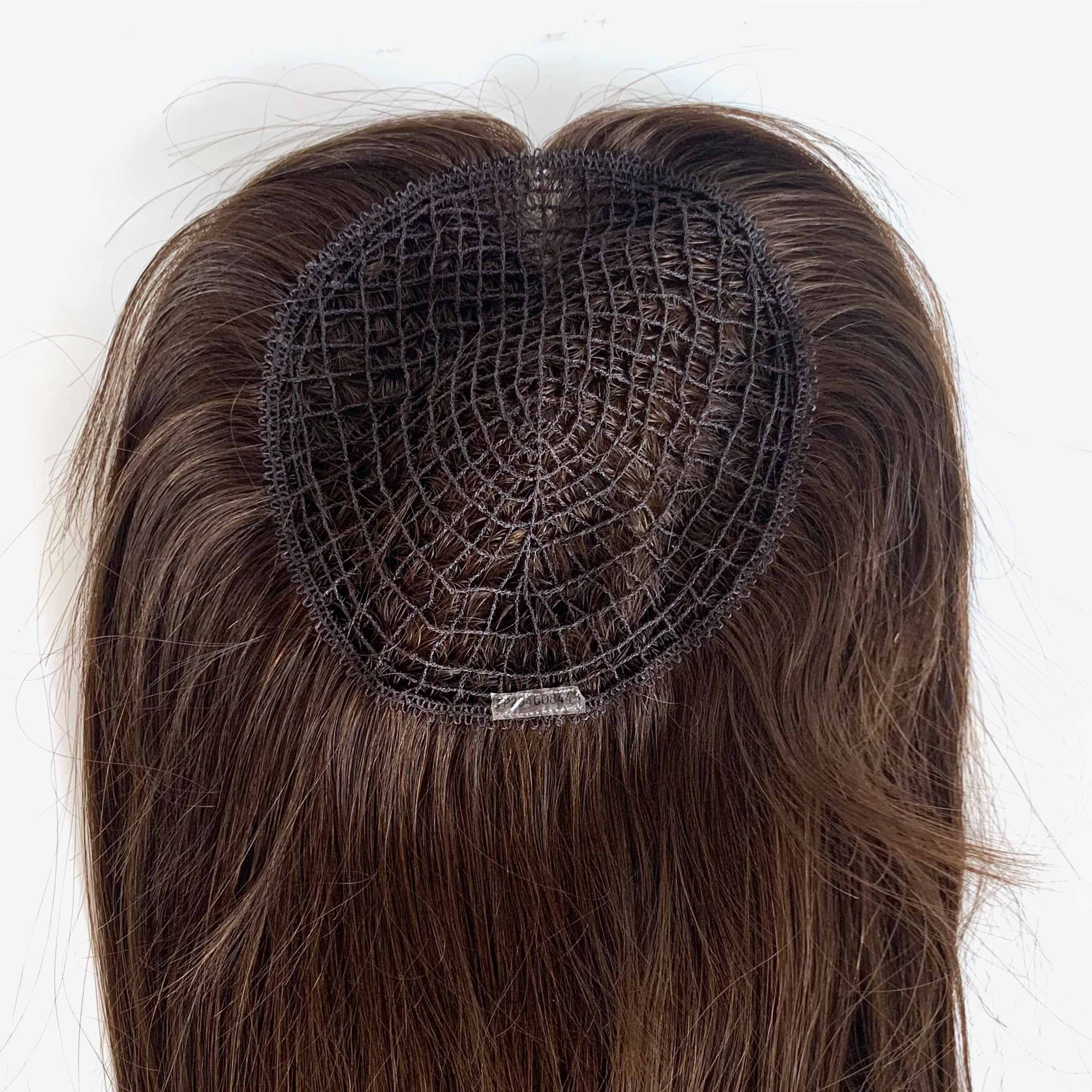 A: A Fish Net Topper features an open mesh base with a grid-like structure—similar to a fishing net. Hair is machine wefted onto the base, creating a lightweight, ultra-breathable topper. It’s one of our most affordable and durable options, ideal for daily wear and warm climates.