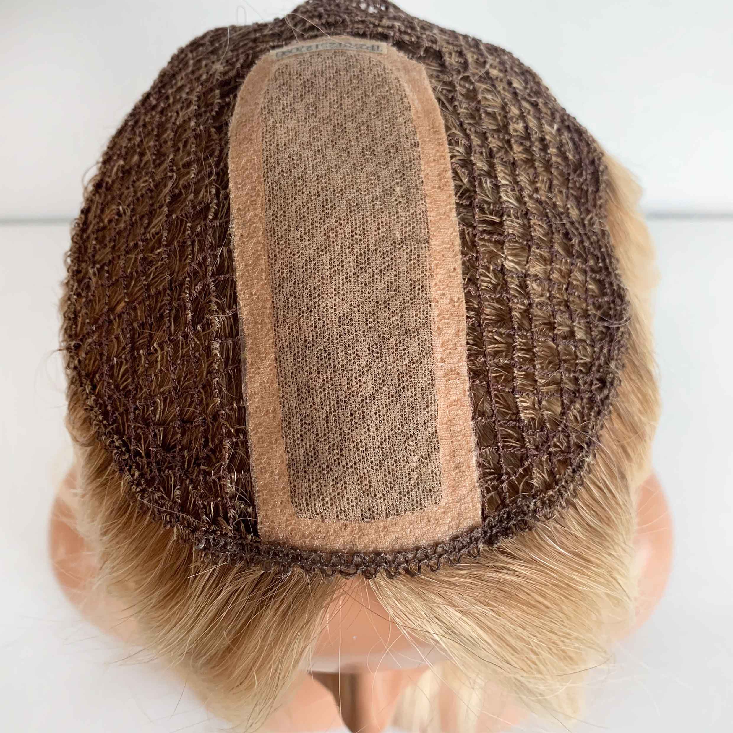 A traditional fish net topper features an open mesh base with visible grid openings—similar to the structure of a fishing net. Hair is typically machine wefted onto this base, meaning strands are sewn into long strips (wefts) and attached to the mesh perimeter.